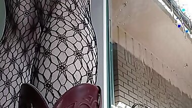 "Beautiful long hair sissy CD crossdresser in lingerie and heels fucks dildo"